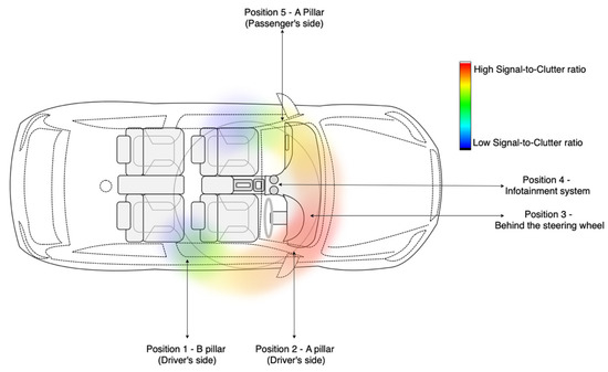 Figure 9) to further validate the laboratory findings under more realistic driving conditions. Five radar positions were evaluated: B-pillar (driver side), A-pillar (driver side), behind the steering wheel, near the infotainment unit, and A-pillar (passenger side). The A-pillar on the driver’s side (position 2) produced consistently high SCR values and was selected for further physiological monitoring experiments. A heatmap visualisation of SCR across cabin positions further validated this choice (