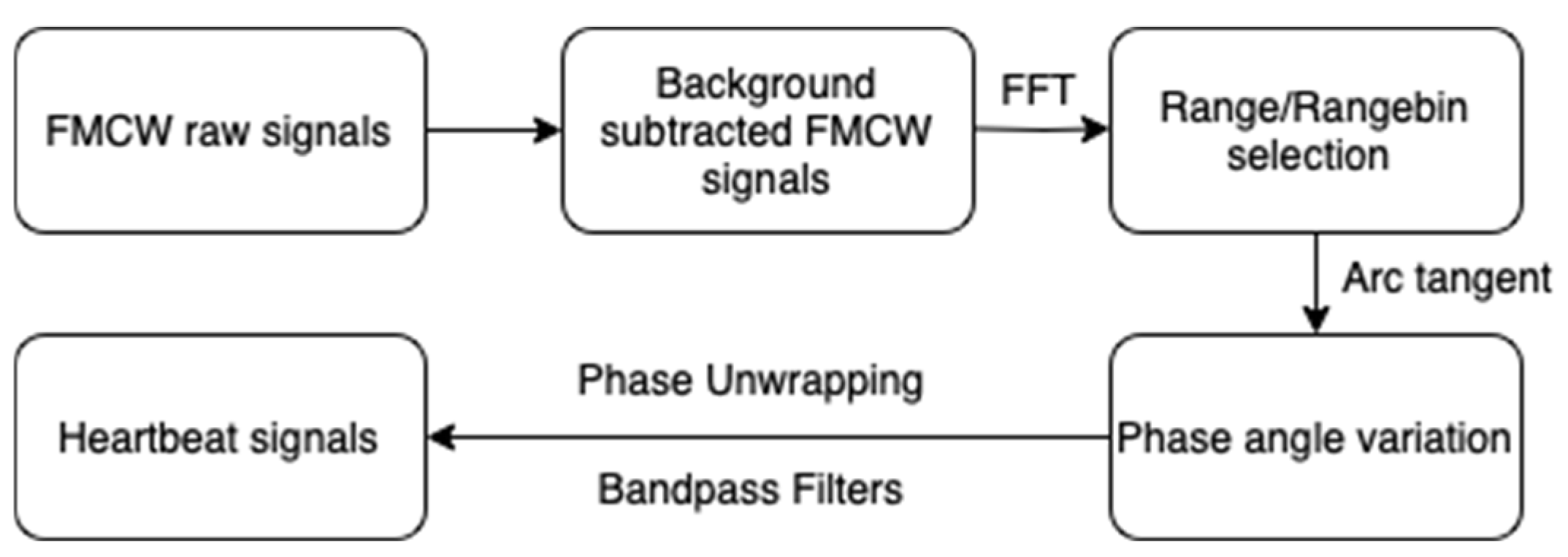 The proposed signal processing pipeline, comprising background subtraction, range bin selection, filtering, and phase unwrapping, enabled the accurate extraction of cardiac-related signals from raw FMCW radar data.