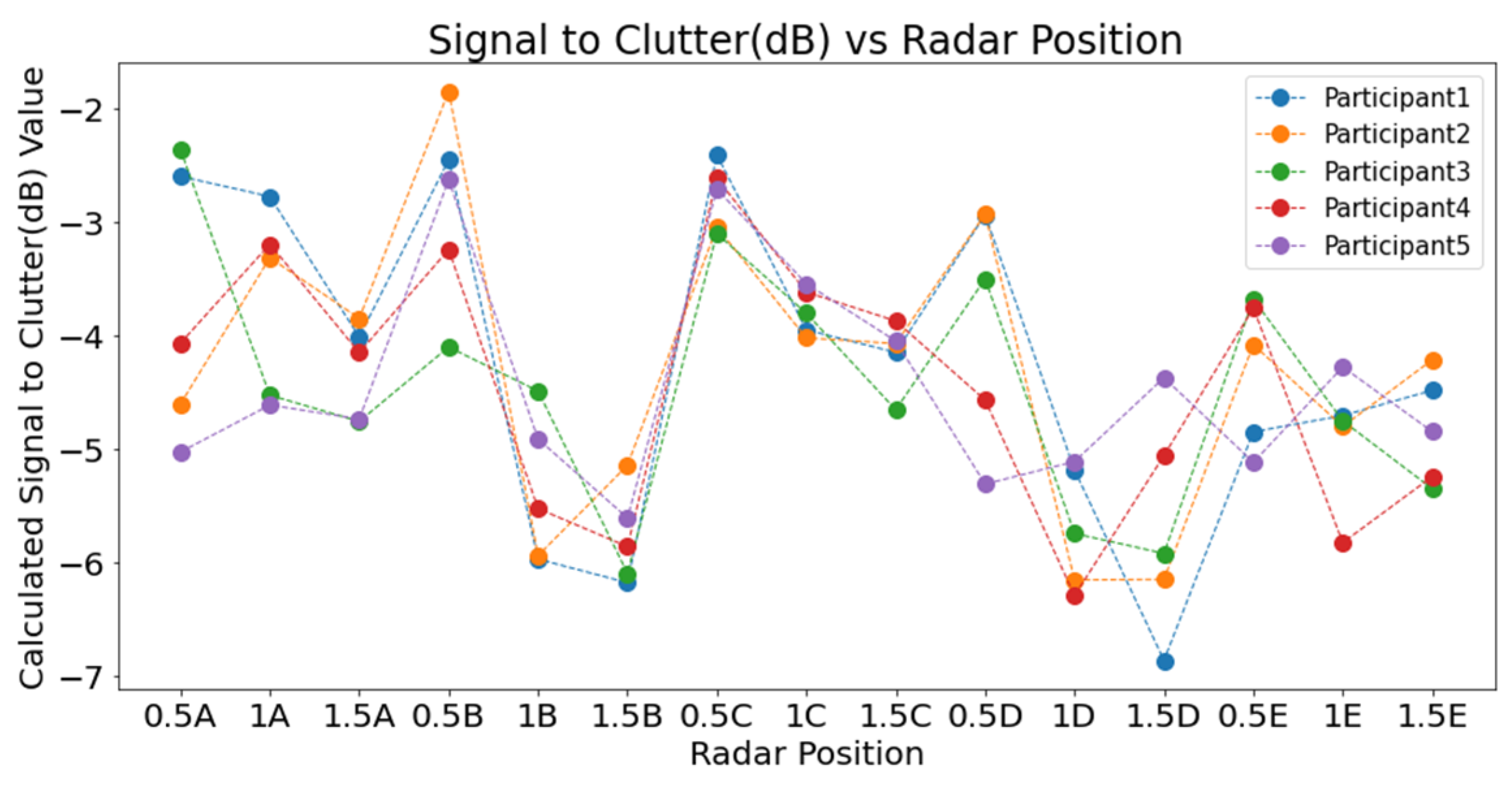 Figure 10, SCR values at each radar position were averaged across participants to evaluate signal quality. Positions at a 0.5 m distance consistently yielded higher SCR values than those at 1.0 m and 1.5 m, confirming that closer proximity improves signal detection. Among these, positions 0.5B and 0.5C recorded the highest values. In contrast, the lowest SCR values were found at 1.5 m across all angular points. The 1.0 m positions showed mixed results, with 1A and 1C performing better than others at that distance. These outcomes highlight the importance of proximity in optimising radar placement for physiological monitoring.