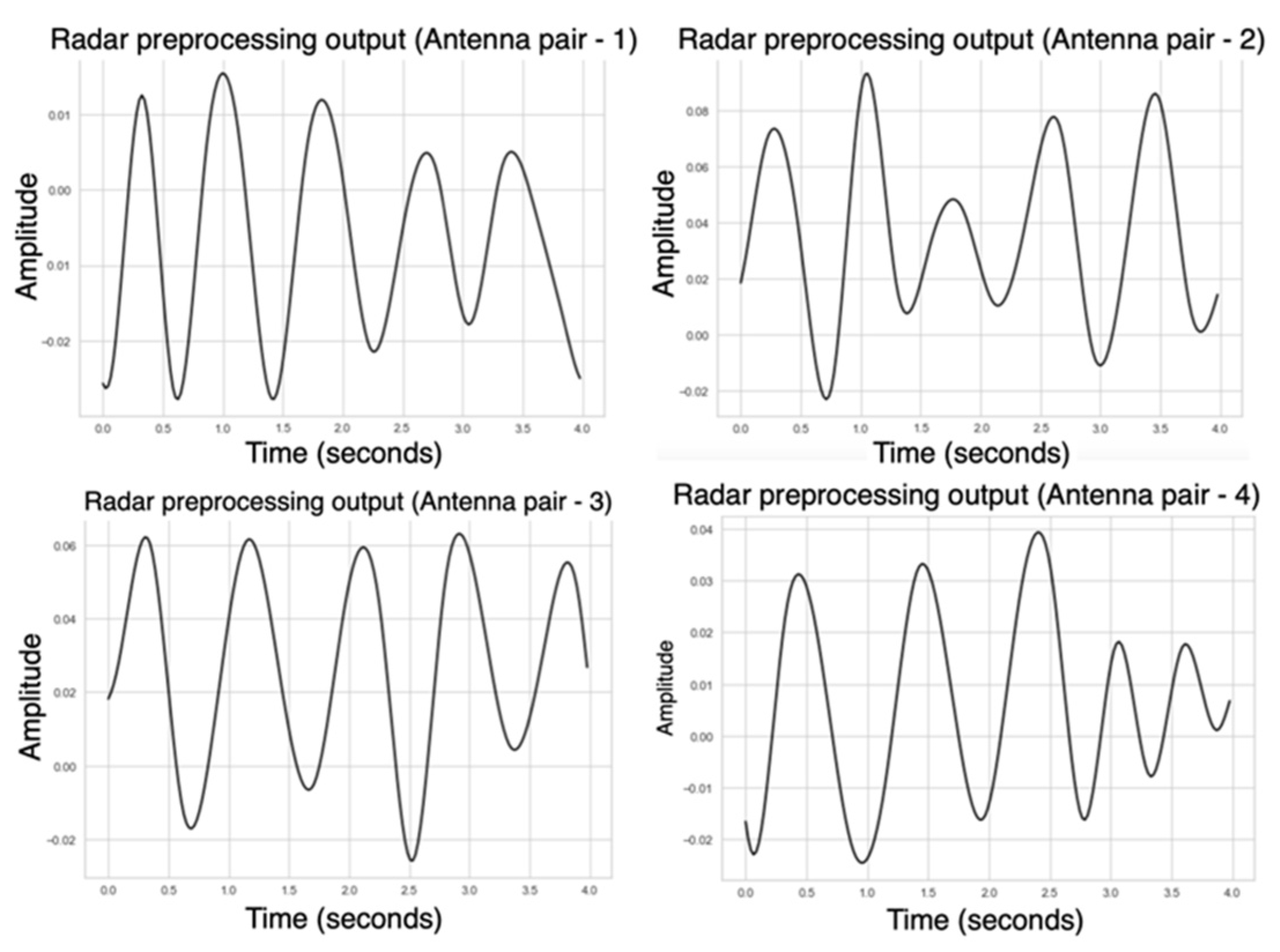 Following placement optimisation, radar signals were processed using the proposed pipeline. Range bin selection, background subtraction, and bandpass filtering were applied to isolate the physiological signal. Phase unwrapping of the complex signal revealed periodic waveforms with clearly identifiable peaks corresponding to heartbeats. During the laboratory experiments, all 40 logical antenna pairs were activated. Following this phase, we realised that the required sampling rate for cardiac activity was lower than initially assumed. According to the Nyquist theorem, reliable detection of heart rate within the 0.8–2 Hz range (48–120 bpm) only requires sampling at least twice the maximum frequency of interest. Based on this observation, in the driving simulator experiments, we activated only four antenna pairs, which provided sufficient sampling while reducing data volume and computational load.