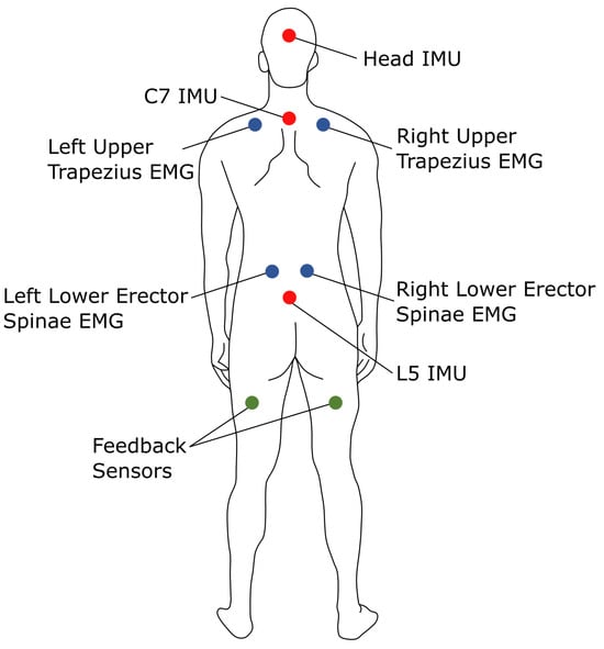Each of the four participants who volunteered for the study self-reported their height, weight, and sex. Muscle activation was recorded with surface electromyography (sEMG) sensors (Cometa, Bareggio, Italy) placed on the lower erector spinae (LES) and upper trapezius (UT) muscles, both of which are involved in posture-related musculoskeletal discomfort and ergonomic equipment [,,,]. Three inertial measurement units (IMUs; SageMotion, Kalispell, MT, USA) were taped to the L5, C7, and posterior head positions to measure the orientations of the pelvis, torso, and head, respectively. The IMUs also include vibrotactile motors for haptic feedback. Two IMUs were placed in the user’s pockets to deliver feedback via leg vibrations, mimicking a cell phone alert. One was placed in the participants’ right and left pocket to give neck and back angle threshold feedback. Figure 1 illustrates the sensor placement.