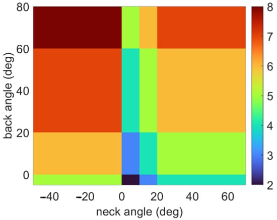 RULA scores for different combinations of back and neck angles. Lower scores (blue) denote safer (ergonomically advantageous) postures, whereas higher scores (red) denote more dangerous (ergonomically disadvantageous) postures.