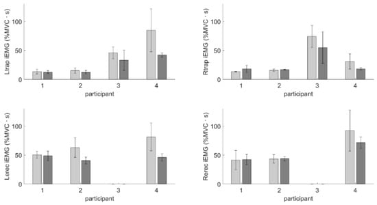 The average integrated EMG (iEMG) for each participant’s evaluated muscles is presented in Figure 3. On average, participants exhibited either nominally unchanged or decreased levels of muscle activation when feedback was present. From these results, we can see that each participant exhibited different postural and muscle activation behavior, particularly in response to the presence of feedback.