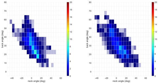 Heatmap for relative amount of time spent in each five-degree bin corresponding to different back and neck angle combinations. The plot on the left is averaged across trials without feedback, and the plot on the right is averaged across trials with feedback. The units for the color bars are the percentage of the total trial time.