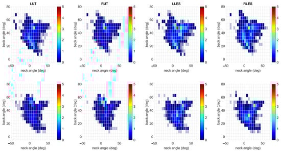 Heatmap for average iEMG for each muscle each back and neck angle combination bin. Each column is for a different muscle. The top (bottom) row is for trials without (with) feedback. The units of the color bar are the percent of the MVC multiplied by seconds.