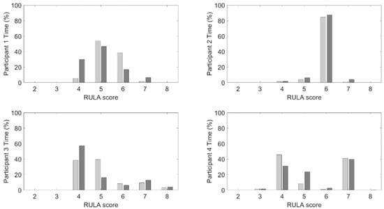 Weighted averages for each participant’s relative times spent in RULA scores.