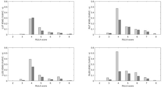 Similarly, Figure 7 shows the iEMG for the amount of time spent in each RULA bin for each participant with and without feedback, and Table 3 reports the weighted averages. While there are no clear trends for the relative times, the muscle activation results show that the weighted averages were reduced when feedback was present.