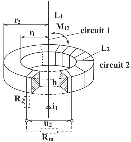 Figure 2 shows the electromagnetic situation in the toroidal inductive sensor in our experiments. The primary conductor with the current i1 passes through the center of the toroid. This current produces a magnetic field and is guided by the magnetic core between the inner radius r1 and the outer radius r2, all along the axial height h. A secondary winding is placed on the core with the self-inductance L2. The mutual inductance with the primary conductor is denoted as M. The induced voltage on the secondary coil is denoted as u2. The winding has a resistance R2 and the measuring circuit includes an external measuring resistance Rm. The figure demonstrates the magnetic coupling path between two electric circuits.