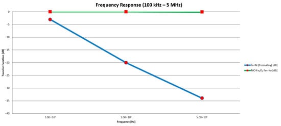In Figure 6, the frequency response for both materials can be seen. This was the key point in the preliminary decision regarding which core material to use for encapsulated inductive sensor construction. It is obvious that for the Permalloy core material, the frequency response curve decreases with the increasing frequency. This indicates high signal attenuation in the frequency range of the partial discharge pulse spectrum causing possible signal wave-shape distortions. This is crucial for signal evaluation at later stages.