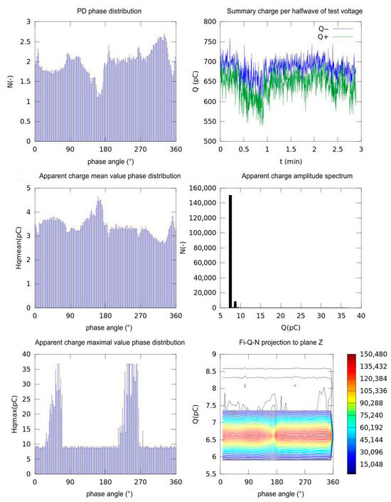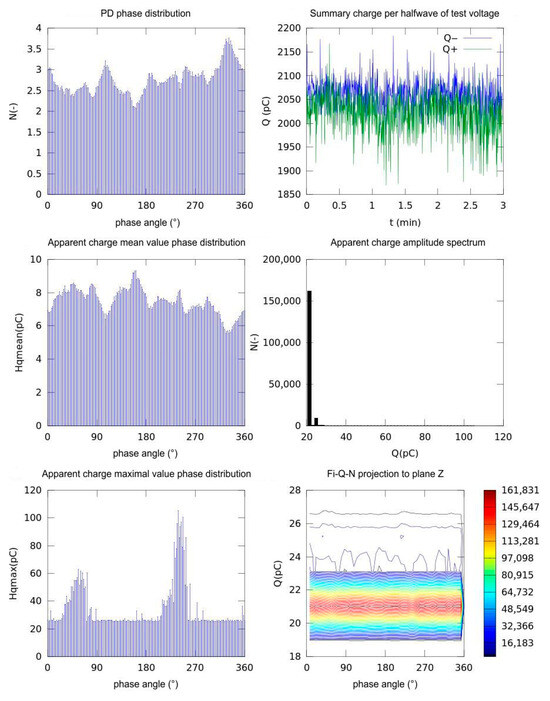 A customized measuring device, equipped with dedicated software for the statistical evaluation of partial discharge (PD) pulse signals, was employed to obtain all of the aforementioned PD activity parameters. In addition, the distributions of the maximum and the mean values of the apparent charge, discharge rate, and amplitude spectrum were calculated. All the charge and apparent charge units were stated in pC (picocoulomb, 1 pC = 10−12 coulomb).