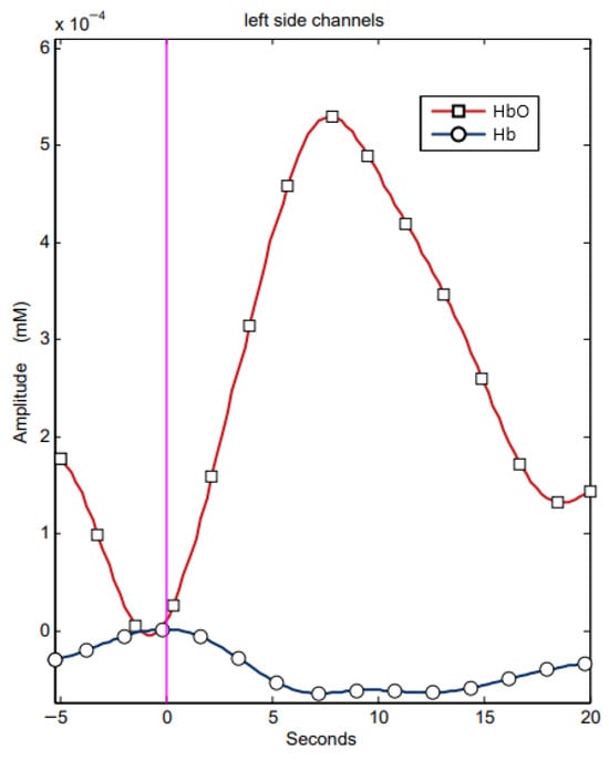 None of the participants reported any symptoms that could affect motor or cognitive function. All participants were neurologically healthy, with no history of epilepsy, brain injury, or significant visual impairment. Figure 4 shows an example recording of the fNIRS signal.