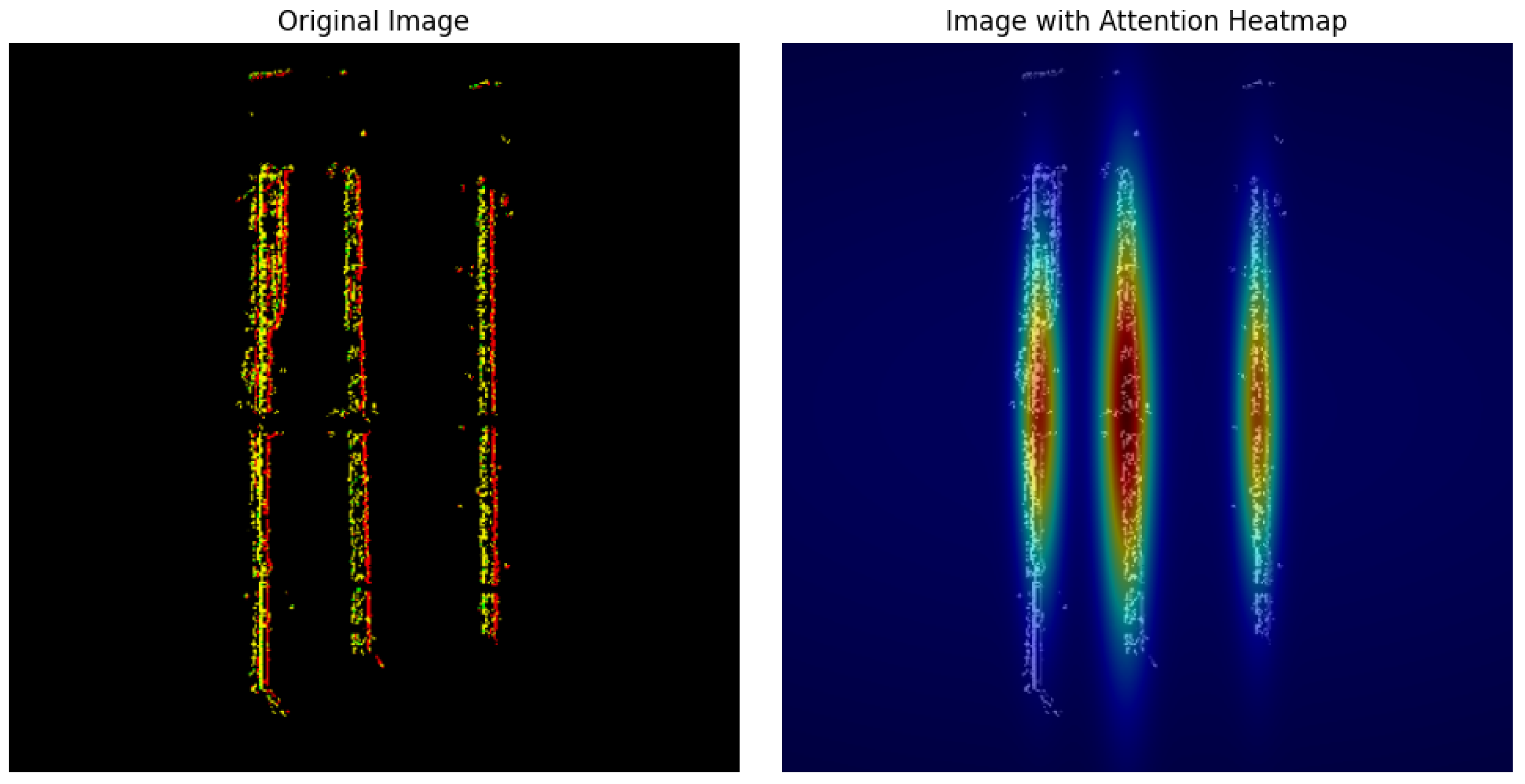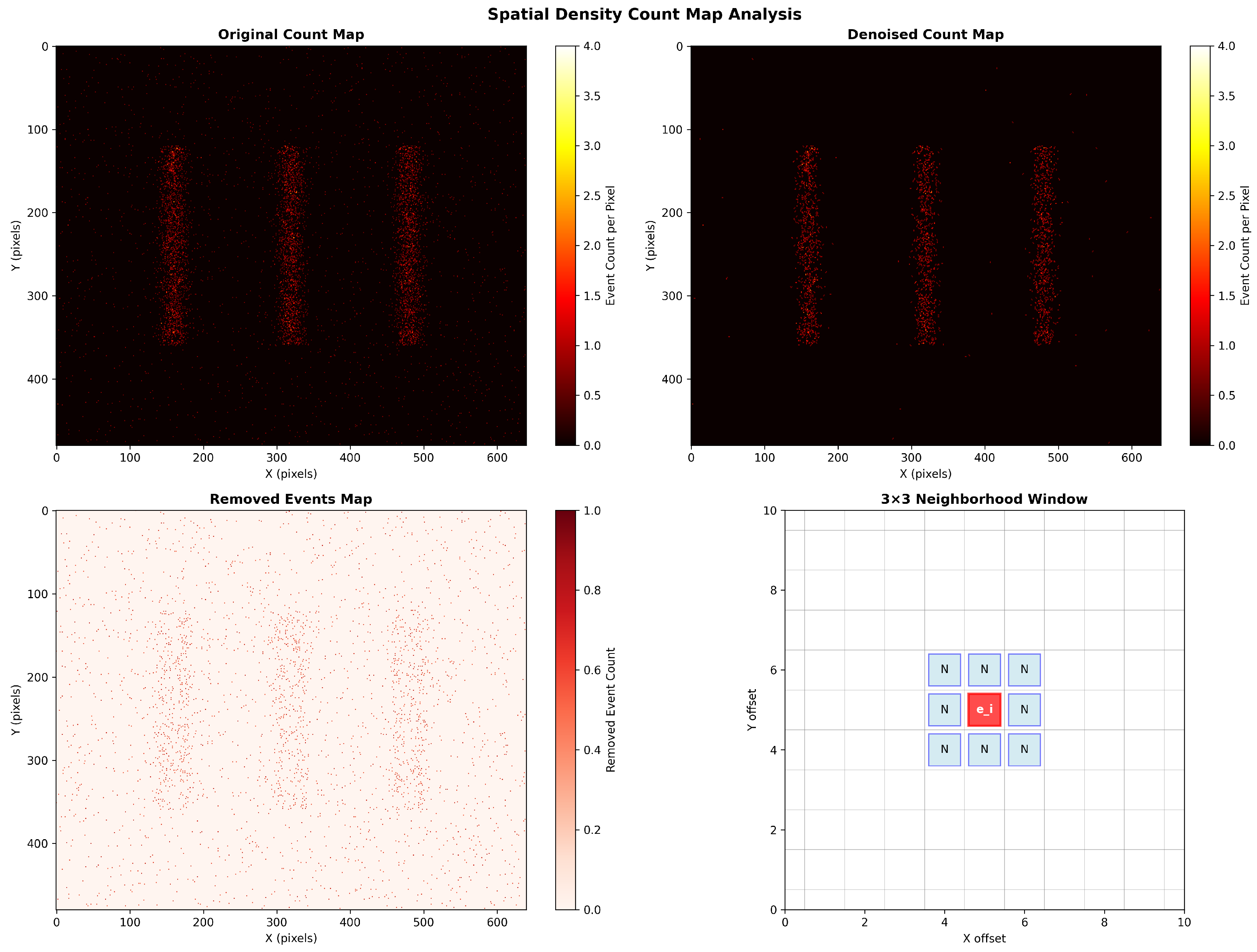 - Final Surface NormalizationAfter iterating through all events within a time window, we perform a min–max normalization on the generated positive and negative time surfaces separately. This operation enhances the contrast of the SAE frames and standardizes their value range for subsequent processing by linearly scaling the pixel values of each surface to the interval . For any given time surface , the normalized surface is calculated as follows [15]:This step is executed only if the surface contains valid events (i.e., ).