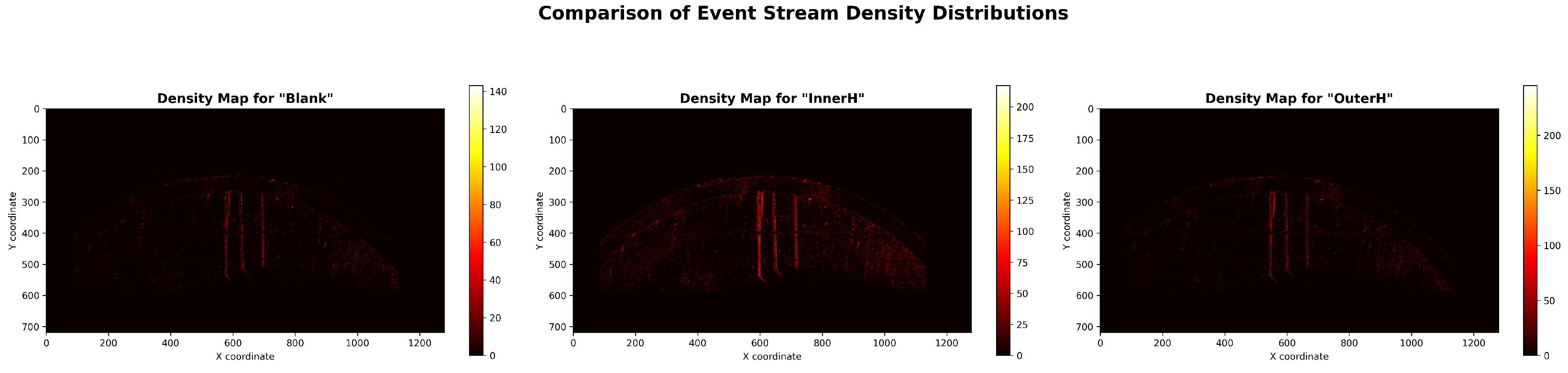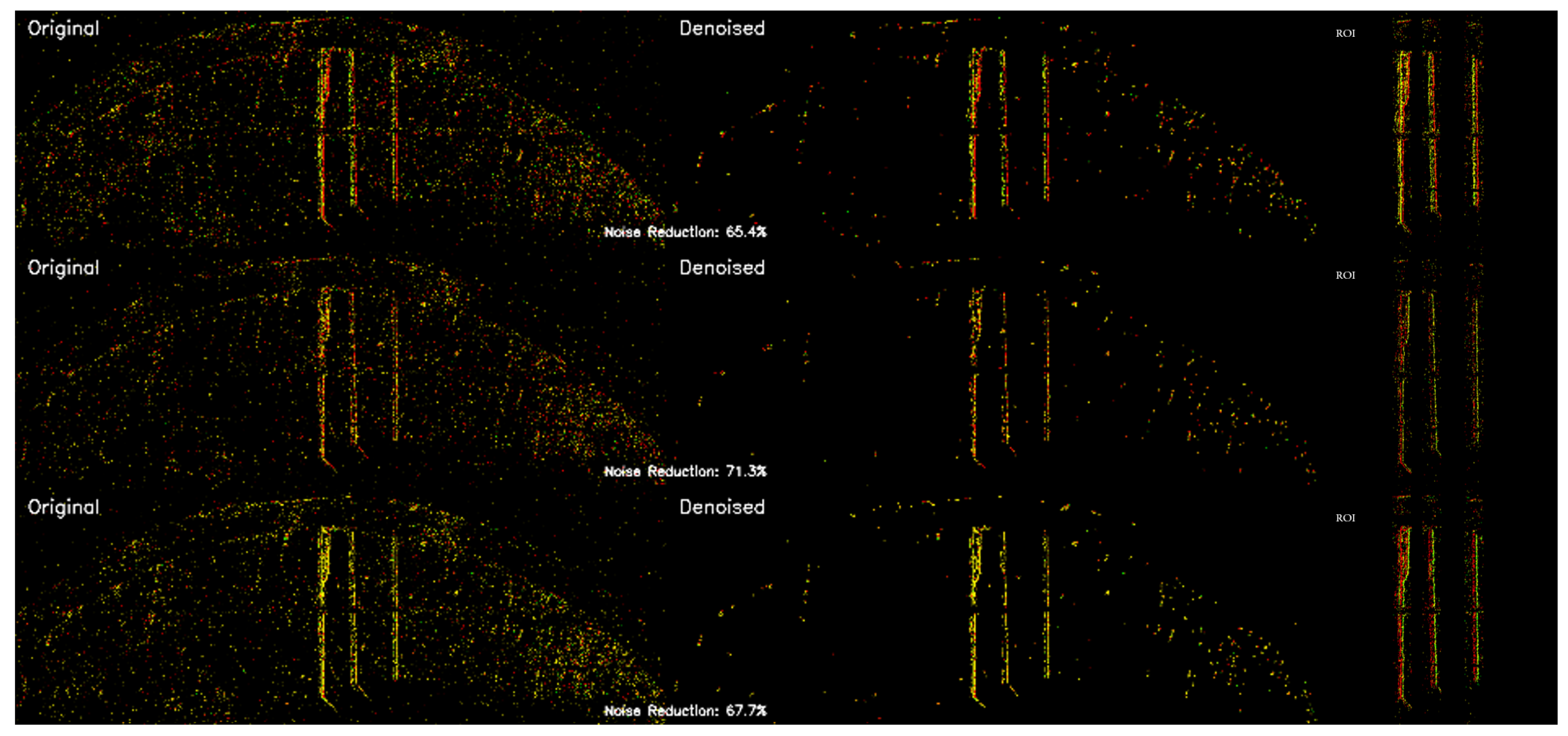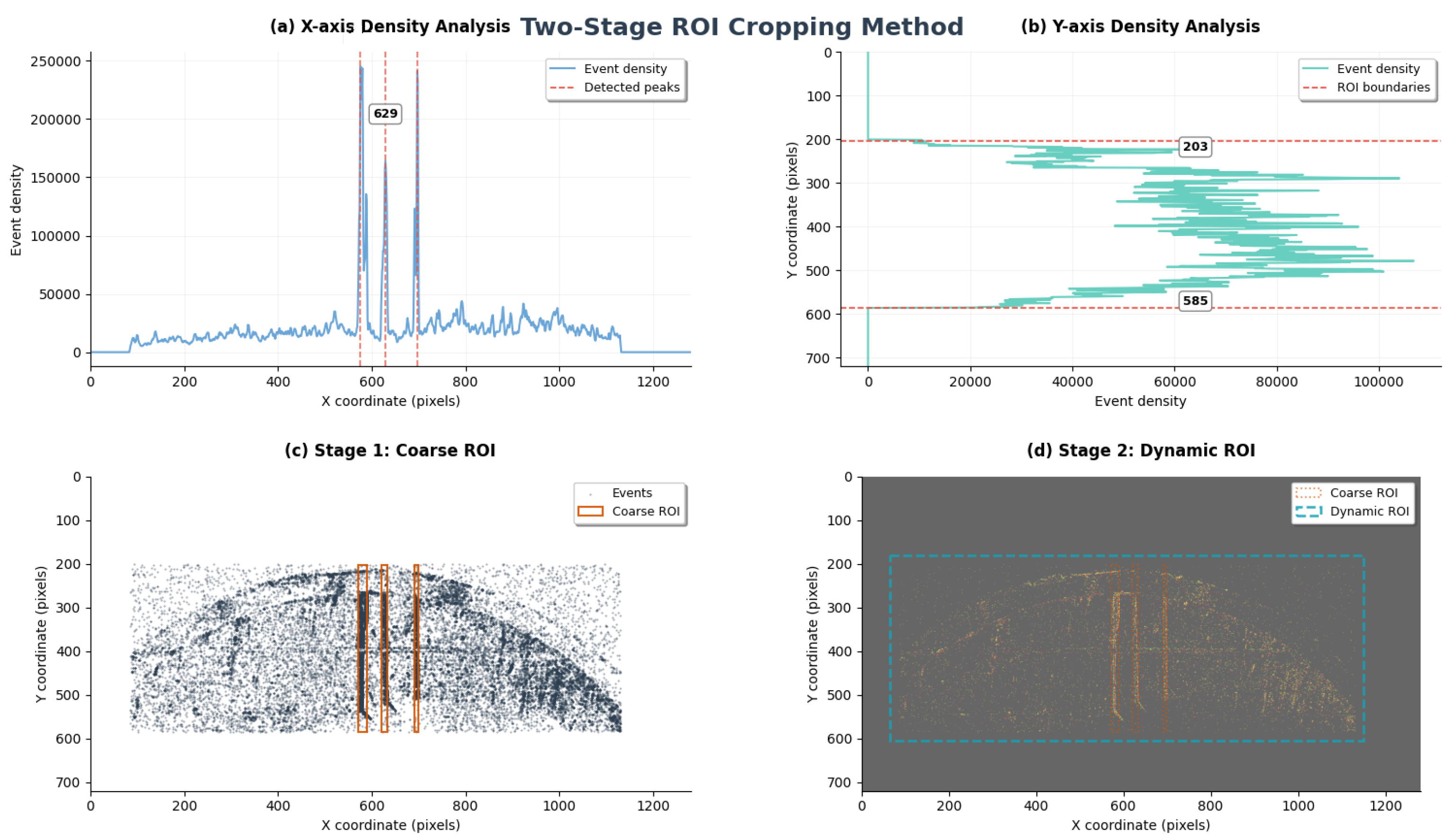 - Coarse ROI Determination via Event Density StatisticsThe objective of this stage is to automatically localize the macroscopic region containing the key bearing structures in a data-driven manner. This process operates directly on the entire raw event stream over a period of time, with its core based on the 1D projection analysis of event density [18]. First, we construct the event density histograms, and , by projecting all events onto the x- and y-axes, respectively:Subsequently, on the x-axis density histogram, we perform a convolution with a 3-point uniform averaging kernel, , to obtain a smoothed density curve, . A multi-constraint peak detection algorithm is then applied to robustly identify the peak locations P corresponding to the three core vertical lines of the bearing:Concurrently, the vertical boundaries of the effective event area, and , are determined from the y-axis density histogram using an adaptive threshold . A similar thresholding strategy is applied locally for each detected x-axis peak to determine its precise left and right boundaries. Through this automated analysis, we can ascertain the optimal ROI parameters for data under various operating conditions, which are then used for the initial coarse filtering of the raw sparse event stream.