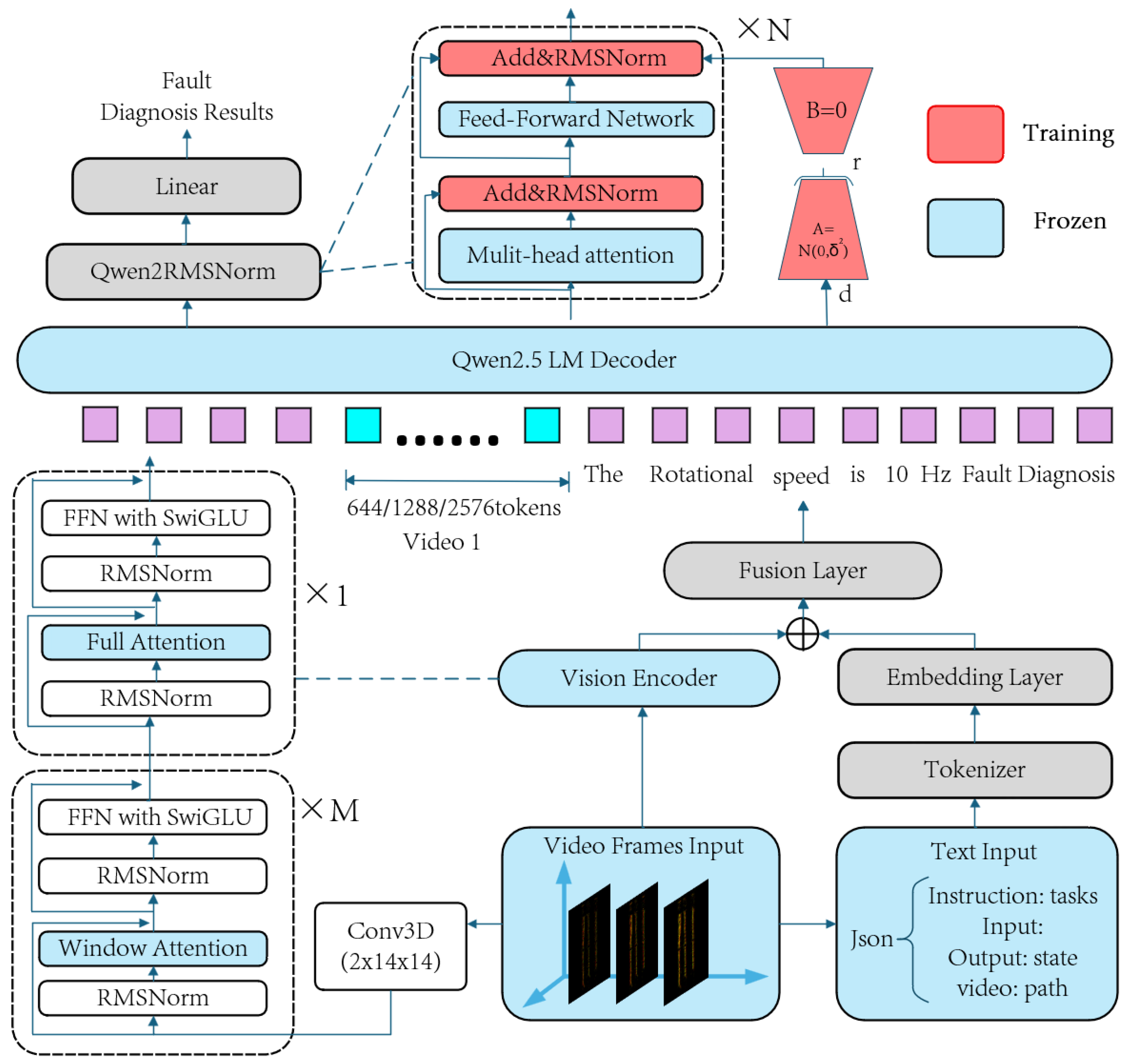- Task-Specific Output Layer: The feature vectors output by the decoder are normalized by a Qwen2RMSNorm layer and then fed into a trainable Linear output head, which maps them to the final fault diagnosis results.