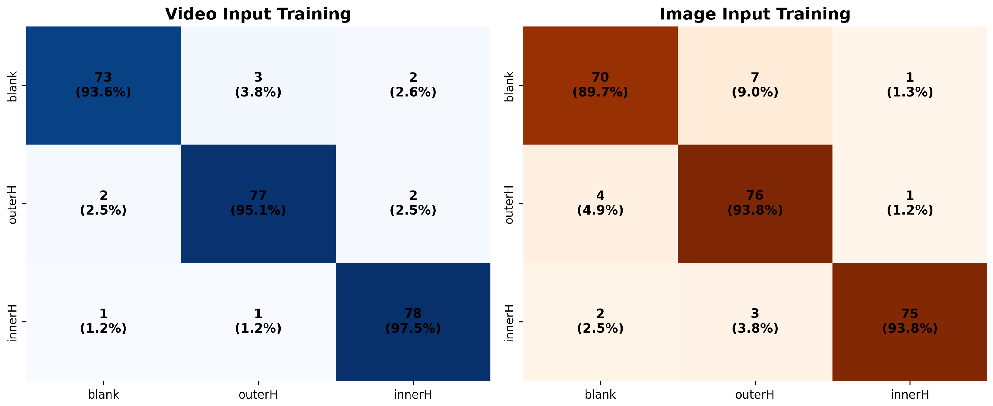 - Scheme 2 (Video-based Diagnosis): The overall diagnostic accuracy reaches 95.44%, showing a significant improvement over Scheme 1. Its per-class identification accuracies for the normal, outer race fault, and inner race fault categories are 93.59%, 95.18%, and 97.50%, respectively, demonstrating a comprehensive performance advantage across all classes.