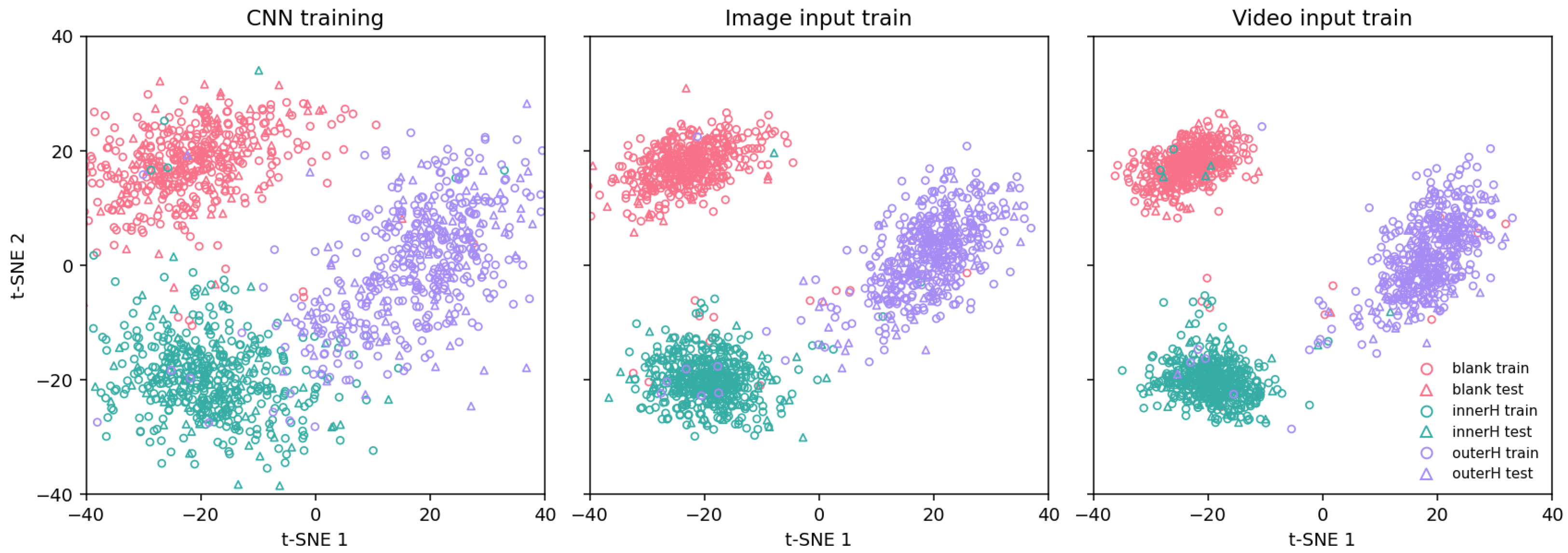 - For Scheme 2 (Video-based): The t-SNE visualization reveals three highly separable clusters. The large inter-cluster distances and high intra-cluster compactness are highly consistent with the quantitative accuracy of 95.44%, robustly demonstrating that the dynamic spatiotemporal features learned from the complete video sequence possess the most powerful discriminative ability.
