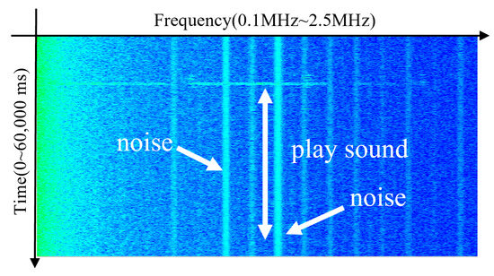 We analyze electromagnetic emissions from Galaxy S21, S22, and S23 smartphones while playing a standard audio file at a volume level of zero for 5 s. As shown in Figure 2, a brief burst of electromagnetic activity was observed near 1.3 MHz, lasting approximately 0.1 s, after which no further emissions were detected. In addition, persistent background noise was present at various frequencies, but these signals were not related to audio playback. Due to the highly transient nature of the observed emission, the signal lacked the temporal consistency required for time-based OOK modulation. Consequently, the previously proposed technique was ineffective on newer smartphone models.
