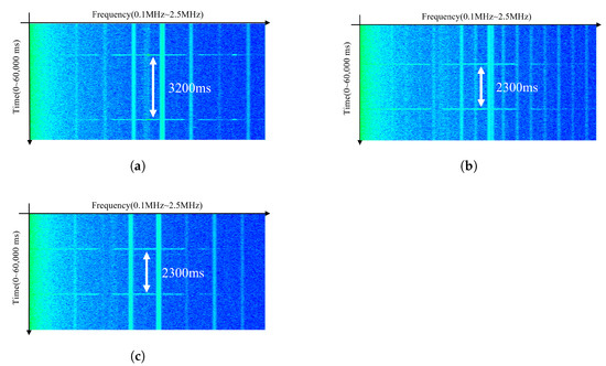Delay-dependent electromagnetic signal re-emission characteristics for three smartphone models. A minimum delay is required for signal reactivation: (a) Galaxy S21 (3200 ms). (b) Galaxy S22 (2300 ms). (c) Galaxy S23 (2300 ms).