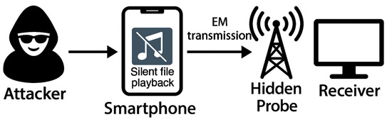 The attacker first installs a malicious application on the smartphone, possibly using a physical infection vector such as a malicious USB charging station or cable, as demonstrated in previous work [16]. The application continuously plays a silent audio file. Although no audible sound is generated, this activity induces electromagnetic emissions from the internal audio amplifier circuit of the smartphone. These unintended signals are radiated and can be captured by a hidden probe or antenna placed close to each other, such as underneath a desk or embedded inside a phone stand.
