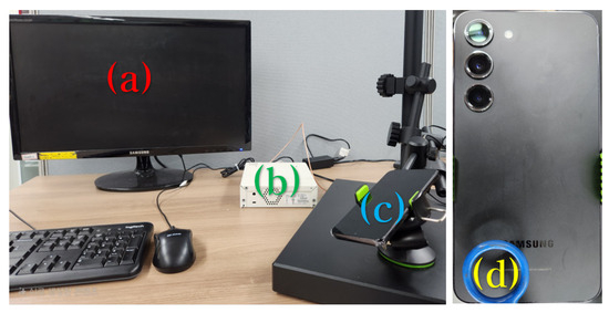 The experimental setup for the proposed electromagnetic covert channel is shown in Figure 6. All experiments were conducted in a typical office environment with common ambient electromagnetic noise. Component (a) represents the receiving PC, which processes the digitized electromagnetic signals. Component (b) denotes the USRP N210 device (Ettus Research, Austin, TX, USA), which functions as an analog-to-digital converter (ADC) to digitize analog electromagnetic signals. Component (c) indicates the transmitting smartphone. Component (d) shows the position of the near-field H-field probe, placed to detect emissions from the speaker area of smartphones.