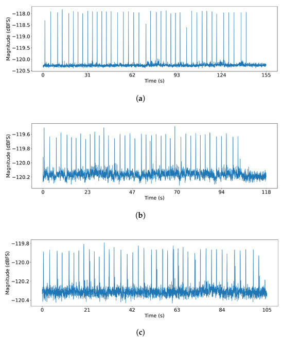 Figure 9 shows the signals received on the PC after transmitting messages from three smartphones using the covert channel application, with the probe placed at a distance of 0.1 cm. As analyzed in Section 3.3, the signal characteristics vary significantly between models. For Galaxy S21 (Figure 9a), the signal is strong and clean, allowing for straightforward demodulation by applying a fixed threshold and measuring the time intervals between the peaks. In contrast, Galaxy S22 (Figure 9b) and S23 (Figure 9c) exhibit weaker amplitudes and intermittent noise between the main signal peaks. This noise makes a simple threshold-based approach unreliable, as the noise can be mistaken for a valid signal peak. To address this issue and enable robust demodulation across all devices, we introduce Algorithm 2.