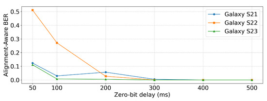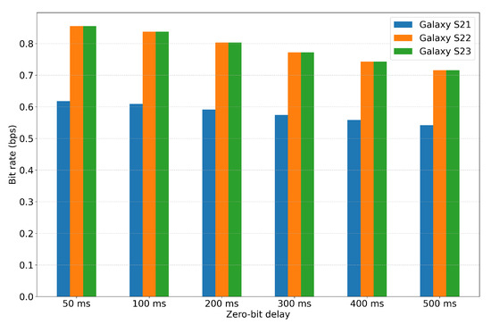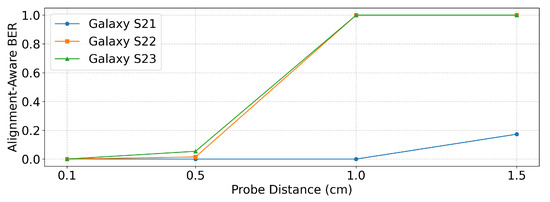 Table 4 and Figure 12 present the results measured at different probe distances. For this evaluation, the zero-bit delay was fixed to the smallest value that achieved for each device, namely 400 ms for Galaxy S21 and 300 ms for Galaxy S22 and Galaxy S23, as determined in Section 5.2.