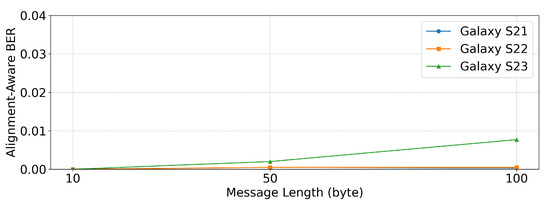 Overall, all three devices maintained a low under extended message lengths, confirming the robustness of the proposed system. In contrast, Galaxy S21 and S22 demonstrated almost identical resilience, whereas Galaxy S23 was slightly more affected by longer transmissions, although its remained sufficiently low to support reliable communication.