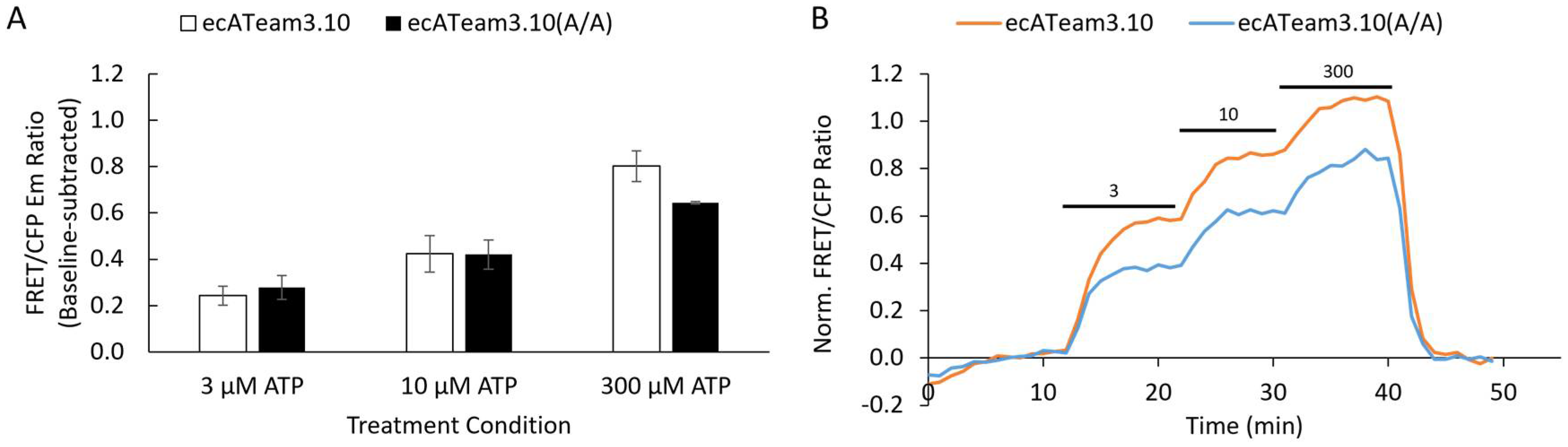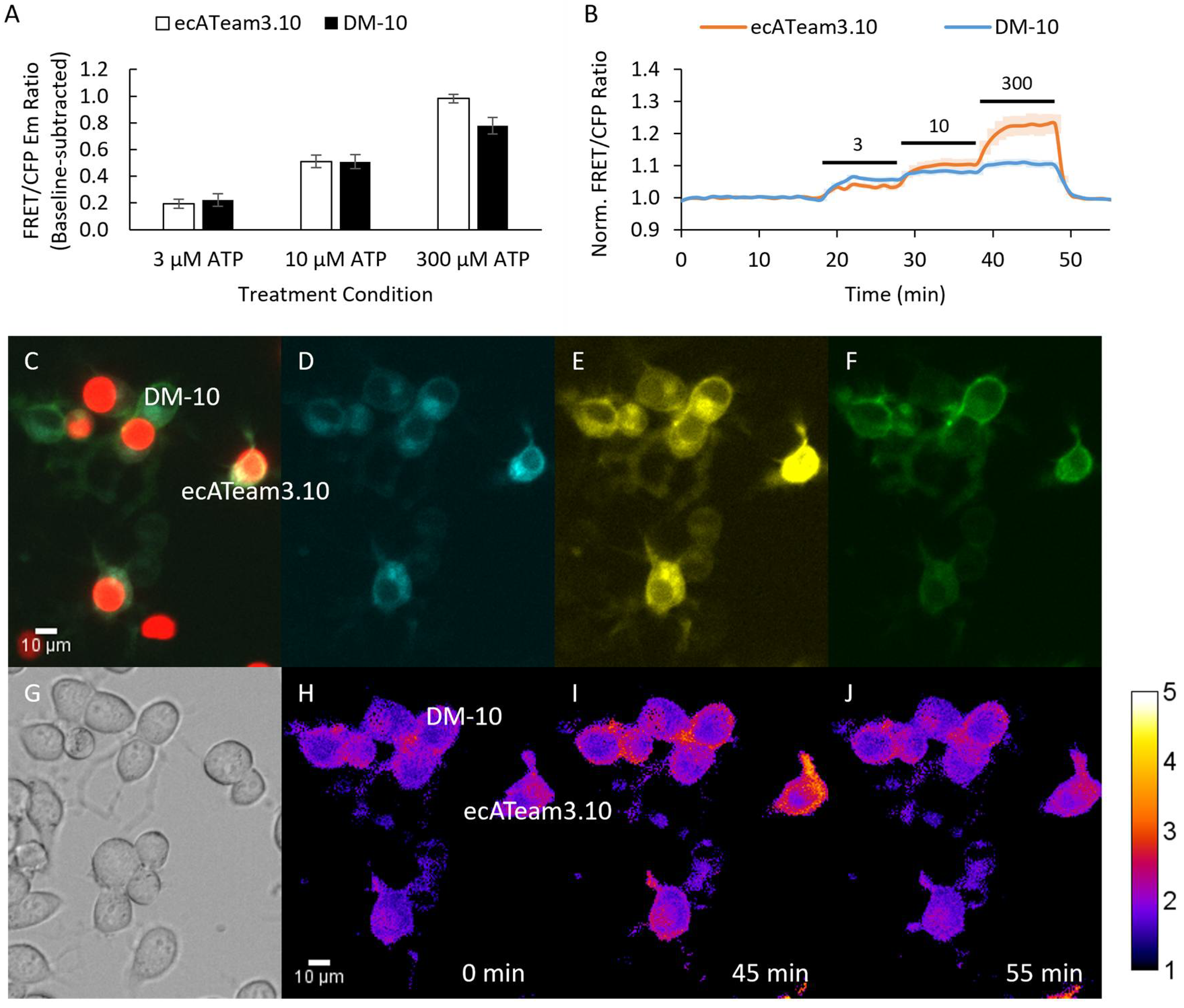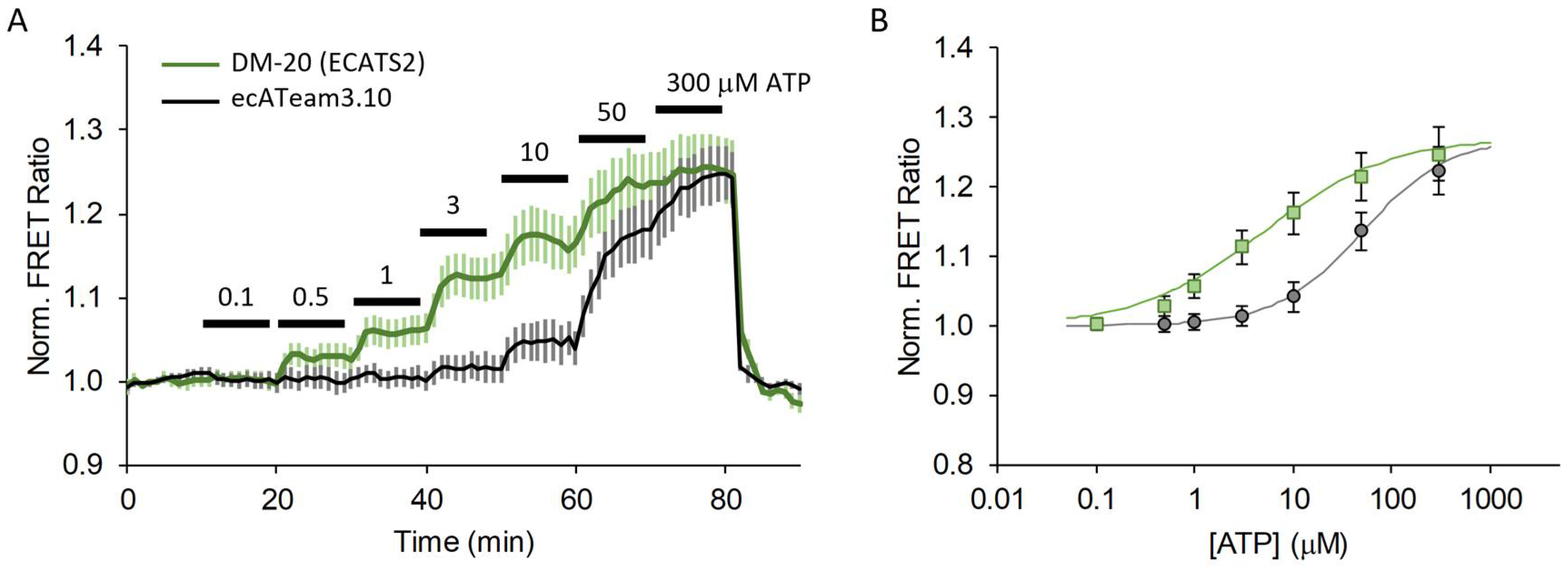 Cholger A, Conley JM, Colomb E, de Cuba O, Kress J, Tantama M. An Improved Ratiometric FRET Biosensor with Higher Affinity for Extracellular ATP. Sensors. 2025; 25(18):5903. https://doi.org/10.3390/s25185903
