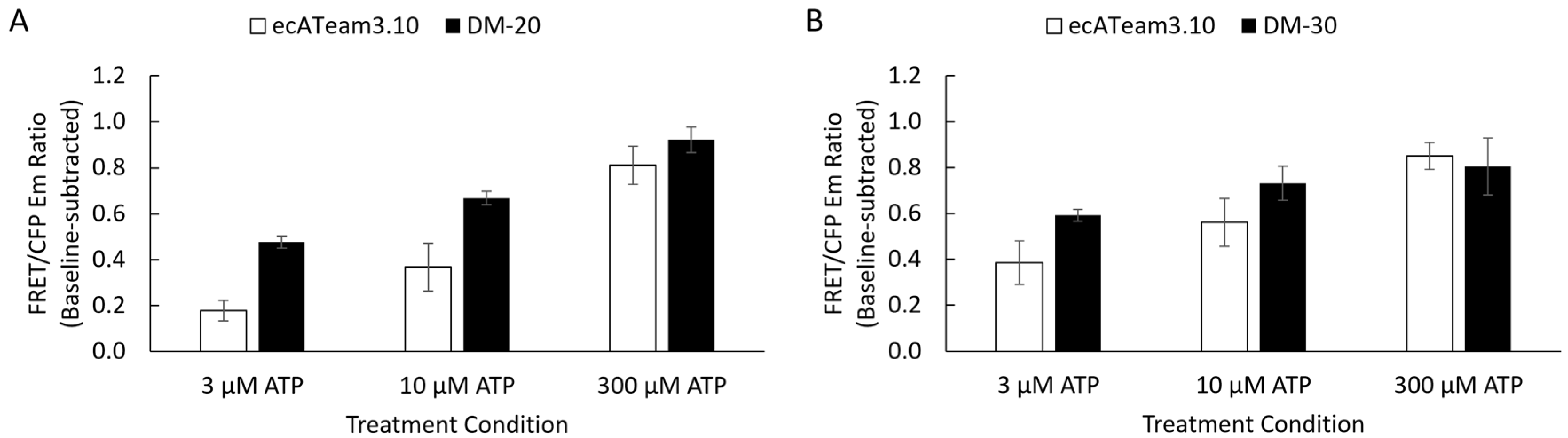 Cholger, A.; Conley, J.M.; Colomb, E.; de Cuba, O.; Kress, J.; Tantama, M. An Improved Ratiometric FRET Biosensor with Higher Affinity for Extracellular ATP. Sensors 2025, 25, 5903. https://doi.org/10.3390/s25185903