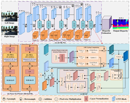 The proposed Adaptive Geometry-aware Stereo-KANformer Network (AGSK-Net) is constructed by systematically integrating the designed modules, namely AG-MSA, SGR-KAN, and DCGF, into a unified architecture. This section focuses on how they are organized into the final network and how key parameters are configured. , , …, denote feature maps at different hierarchical stages of the network, where deeper levels correspond to lower spatial resolutions and larger channel dimensions. The overall pipeline is illustrated in Figure 1a.