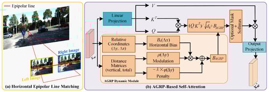 where Q, K, and V represent the Query, Key, and Value matrices, respectively. is the dimensionality of the key vectors, and represents the attention scores. B denotes the relative position bias, which encodes spatial relationships. As a key factor for performance enhancement, the bias remains crucial for dense unsupervised stereo matching. However, the design of the relative position bias is inherently isotropic, treating displacements in all directions equally. As shown in Figure 2a, this fundamentally contradicts the anisotropic physical prior in rectified stereo matching, where the matching search is strictly constrained along horizontal epipolar lines.