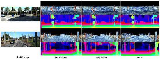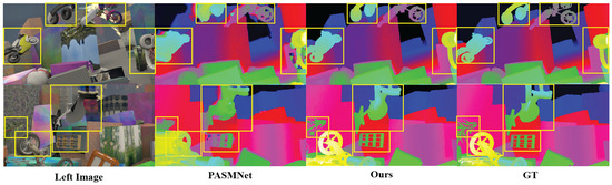 Furthermore, Figure 6 presents a comparison of disparity estimation performance between the proposed approach and the baseline PASMNet on the Scene Flow test set. By comparing the areas marked with yellow rectangular boxes, it is evident that the proposed approach outperforms the baseline in challenging and fine-grained regions, such as occluded cylinders, wheels, motorcycles, and headphones. This further validates the effectiveness of the proposed AGSK-Net with geometric perception capability in jointly modeling multi-scale global information and local geometric details.