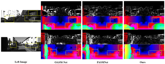 Predicted disparity maps on the KITTI 2012 test dataset. The results of our approach perform better than PASMNet and OASM-Net in ill-posed regions, such as occlusions, repetitive textures, and edges, etc.