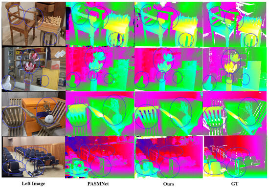 Predicted disparity maps on the Scene Flow test set. The results of our approach perform better than PASMNet in regions with occlusions, edges, and complex geometric details, etc. The GT represents the ground-truth disparity.
