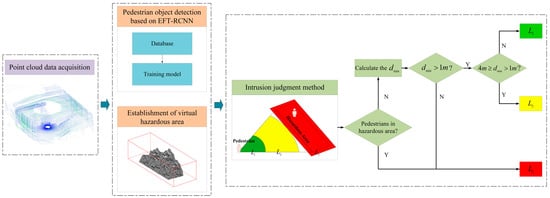 Technical research route. First, acquire the point cloud data for the coal yard. Then, use the pre-trained pedestrian object detection model EFT-RCNN to detect pedestrians and simultaneously establish a virtual hazardous area. Finally, use the hierarchical judgment method to obtain the grade and distance of the pedestrians from the hazardous area. Here, represents the minimum distance of the pedestrian from the boundary of the hazardous area, is the pre-judgment layer, is the warning layer, and is the alarm layer.