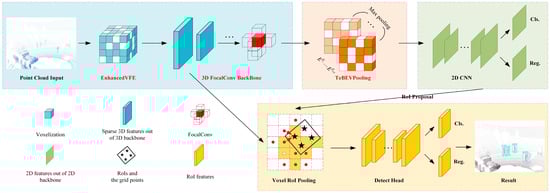Overall architecture of EFT-RCNN. The blue section pertains to point cloud voxelization and voxel feature extraction. The orange section converts 3D sparse tensors into 2D BEV images. The green section focuses on 2D feature extraction and detection of BEV images. Finally, the yellow section represents the 3D RoI detection head. The text in red indicates the improved module.