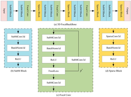 Three-dimensional backbone network based on focal convolution. (a) The overall structure of the 3D backbone network based on FocalConv. (b) The submanifold sparse convolution block. This convolution block ensures sparsity while only adding a relatively small amount of computational burden. (c) The focal convolution. This convolution block has two branches. The structure of the main branch is similar to that of the sub-flow sparse convolution block, while its side branch can assist the main branch in distinguishing difficult samples by independently predicting weights. (d) A spatial sparse convolution block with a larger receptive field to extract deeper information.