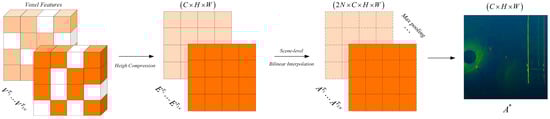 Feature alignment: Coordinate alignment is performed on voxel features from different transformation channels (such as features after rotation or flipping), and the BEV features under different transformations are mapped to the same coordinate system through bilinear interpolation. Specifically, the voxel features are first transformed based on different rotation and flipping angles, which can be formally expressed as , as shown in Equation (4). Subsequently, they are compressed along the height dimension to obtain BEV features , as shown in Equation (5). Since the BEV features are obtained under different transformations, they need to be aligned to the same coordinate system. A set of scene-level grid points are generated in the coordinate system , and according to the transformation operations, the grid points are converted into a new set of grid points in the BEV coordinate system, as shown in Equation (6). Finally, a series of bilinear interpolations are applied on the BEV features to obtain a set of aligned features , as shown in Equation (7).