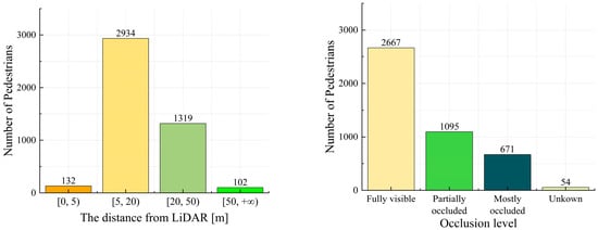 The KITTI dataset [] is commonly used in research on 3D object detection. This dataset includes data from various target objects collected using color cameras, grayscale cameras, and LiDAR, recorded in a real traffic environment over a six-hour period. The dataset consists of 7481 training and 7518 testing point cloud data points. The KITTI 3D object dataset is primarily utilized for 3D object detection, containing numerous 3D point cloud, annotation, and calibration files from real-world scenarios. The detection categories include Car, Pedestrian, Truck, Van, and Cyclist. There are approximately 4500 training instances of Pedestrians with 3D labels. This study mainly evaluated the Pedestrian category. The geometric statistics of the distance distribution and occlusion distribution of the pedestrian category in the dataset were obtained by processing all the label files (label_2/*.txt) in the KITTI dataset, as shown in Figure 7. The pedestrian category contains instances with different distances and occlusion conditions; therefore, it can accurately represent pedestrian targets in real working conditions. This study used this data as the training sample for object detection.