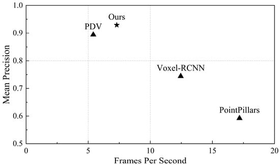 For these three scenarios, we evaluate the proposed EFT-RCNN and various advanced models (including baseline network Voxel-RCNN, PointPillars, and PDV) from both Precision and FPS aspects, as shown in Table 4. In terms of algorithm accuracy, EFT-RCNN achieved the highest detection accuracy of 92.9% among all contrast models. In terms of algorithm efficiency, PointPillars achieved the highest FPS; the detection efficiency of EFT-RCNN was 7.3 FPS. Figure 11 shows the results of this comparison. FET-RCNN strikes a balance between accuracy and acceptable real-time performance, making it suitable for safety-oriented applications in areas such as safety monitoring. For some applications that require high efficiency and can sacrifice accuracy, methods such as PointPillars and Voxel-RCNN can be considered. This efficiency difference stems primarily from the fact that the actual deployed system needs to receive the original point cloud data stream from the LiDAR in real-time through the CPU, and execute the complete early-warning workflow simultaneously. Despite these additional system processing environments, the algorithm in this study meets the requirements of real-time monitoring applications for pedestrian movement scenarios under actual deployment.