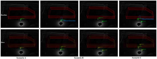 We compare the baseline network and EFT-RCNN detection results under three scenarios, as shown in Figure 12. The Voxel-RCNN model exhibits obvious missed detection problems in complex scene environments. The missed detections are mainly caused by pedestrian overlap, which is particularly severe in scenarios with occlusions (Scenario B) or multiple people (Scenario C). The proposed network enhances geometric feature extraction in 3D space through EnhancedVFE, improves detection ability under sparse point clouds, and effectively suppresses complex background through FocalConv-focused foreground human target extraction. These improvements enhance the robustness of detection. In the figure, EFT-RCNN can detect all pedestrians in the scene without interference from sparse point clouds, occlusion, background environments, and other factors.