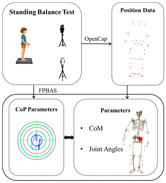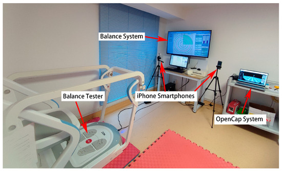 Data were collected in the Department of Rehabilitation Treatment at Eber Hospital. The standard clinic rehabilitation assessment room was equipped with a markerless motion capture system (MLS) consisting of two iPhone smartphones, a force plate system (FPS) with a balance tester. Following OpenCap’s recommended two-camera setup, smartphones were mounted on tripods at a distance of 2 m from the participant and 1.1 m in height. The cameras were positioned at an angle of approximately 20–30° relative to the sagittal plane in front of the participants. The balance tester (Balance-B, NCC, Beijing, China) is a computerized device designed to evaluate coordination and balance using four piezoelectric sensors to track the CoM projection [19].