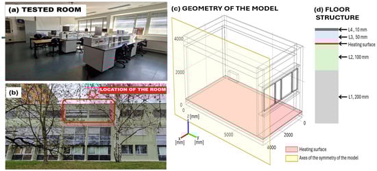 Tested room and its model. (a) Photo of the room interior. (b) Outside view of the room location. (c) Half-room geometry and symmetry plane display. (d) Structure of the model’s floor.