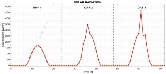Boundary condition of simulations indicating the intensity of solar radiation during three days of room heating.