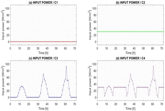 - Case 4 (C4)—A combination of 20 percent of current solar radiation and 30 W/m2 of supplied energy (see Figure 3d).