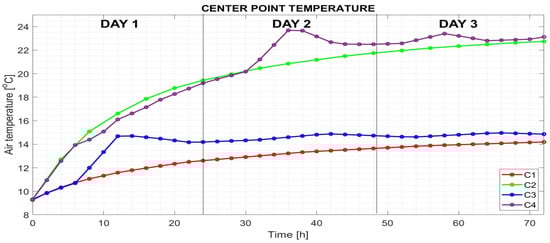 In heating mode C4, energy was supplied in a combined manner: a constant heating power of 30 W/m2 was maintained during the night, while solar radiation was used for heating during the day, following the time course shown in Figure 3d. Similar to mode C3, mode C4 exhibited fluctuations in room air temperature. After 72 h of heating, the air temperature at the center of the room reached 23.1 °C.