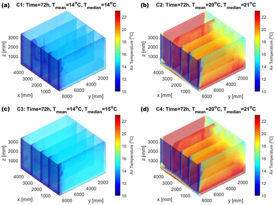 Distribution of air temperature inside the room at 72 h for heating modes (a) C1, (b) C2, (c) C3, and (d) C4.
