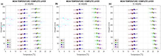 Comparison of mean air temperatures at selected vertical (z-axis) positions in the room at (a) 24 h, (b) 48 h, and (c) 72 h for heating modes (a) C1, (b) C2, (c) C3, and (d) C4.