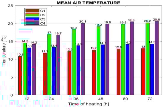 The efficiency of the monitored heating modes was further evaluated based on mean room temperature values, which were calculated by MATLAB after processing and approximating the simulation output data. The resulting mean air temperatures over the heating period from 12 to 72 h are graphically represented in Figure 7.