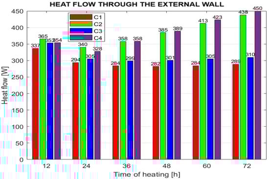 During the heating period from 12 to 72 h, heat losses through the room’s exterior wall were also monitored. The results are presented in Figure 8.